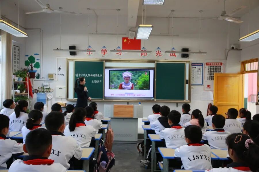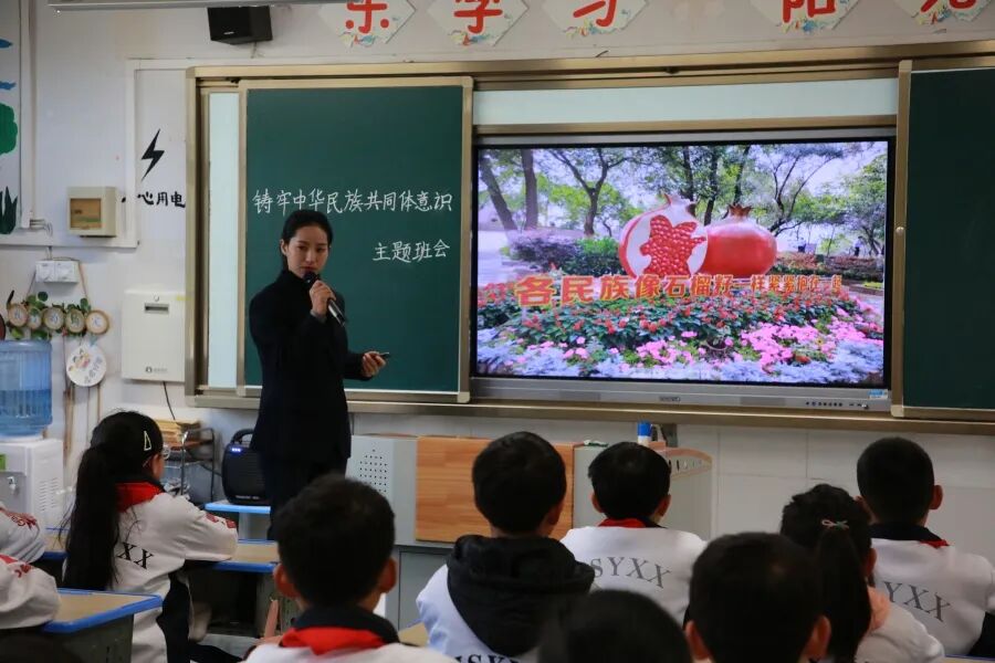 在五(6)班的主题班会上,班主任陈旭妮微笑着站上讲台,指尖轻点班班通屏幕,一幅幅色彩鲜亮的PPT随之展开。她以石榴籽为喻,绘声绘色地讲解着“各民族要像石榴籽那样紧紧抱在一起”的深意。“孩子们看,石榴籽不管多少,都紧紧抱在一起,就像我们土家、苗、汉、侗等各族同胞,永远是相亲相爱的一家人。”她从石榴果粒抱团生长的特性,讲到各族同胞守望相助的情谊,不时穿插互动提问,让抽象的理念在直观画面与趣味交流中,深深扎根在孩子们心中。