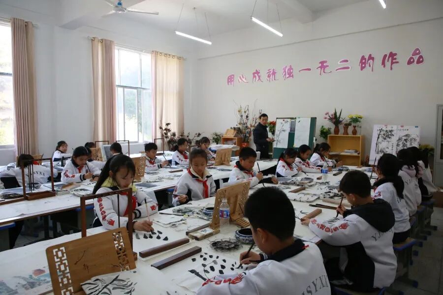 走进学校少年宫,民族文化交融的活力扑面而来。国画室里,老师正耐心指导学生勾勒竹子的轮廓,笔尖流转间,一棵棵竹子在画纸上渐次逐渐成形;软笔书法室里,学生们挺直腰板,手握毛笔书写“民族团结一家亲”“同呼吸,共命运,心连心”等字样,让民族团结的理念在笔墨书香中深深扎根;民乐演奏室里,二胡的醇厚、古筝的灵动、笛子的悠扬交织在一起,学生们正在老师的指导下学习指法和节奏。三年级学生张栩菲指尖轻拨琵琶弦,神情专注而投入。“我喜欢学琵琶,同学喜欢扬琴,现在我已经能和大家合奏《瑶族舞曲》了!”练习结束后,张栩菲脸上洋溢着喜悦。