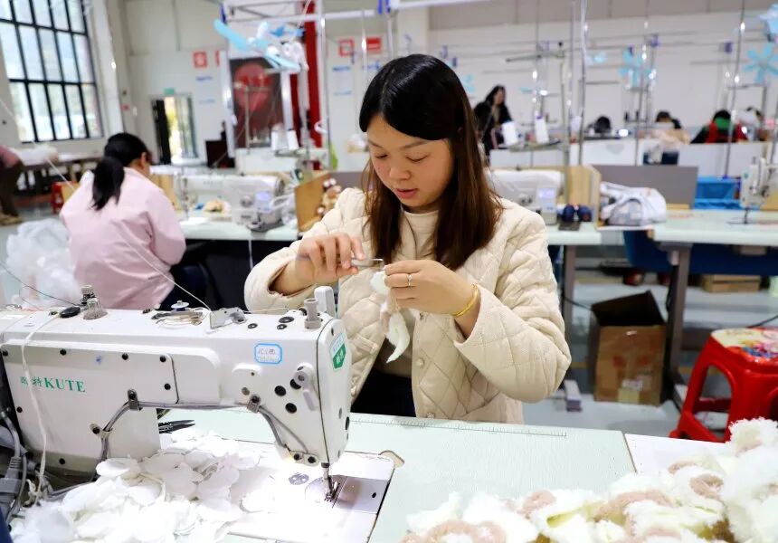 同样,在一墙之隔的银泰玩具厂生产车间,数十名工人分工合作分布在流水线上,毛绒玩具在工人们灵巧的手指尖手中逐渐成型。车间负责人代婧表示,毛绒玩具产品在市场上越来越受欢迎,接近年尾,订单不断,目前正在加班加点赶制订单。