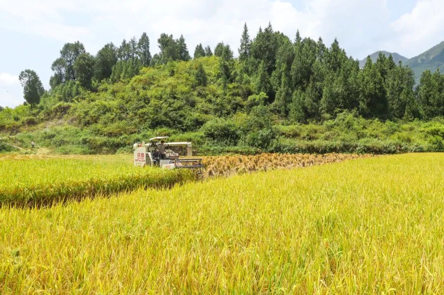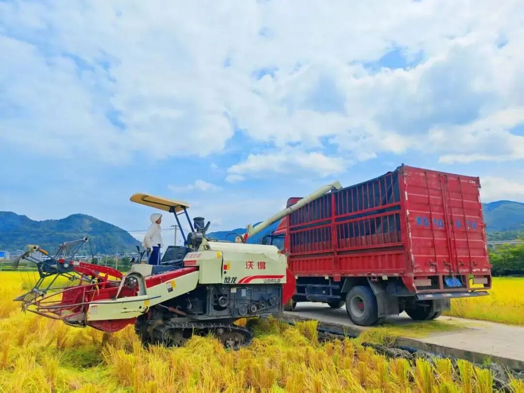 广袤的田野上,金黄的水稻随风摇曳,农机轰鸣穿梭,农户忙碌劳作,勾勒出一幅“粮满仓、民增收”的喜人画卷。