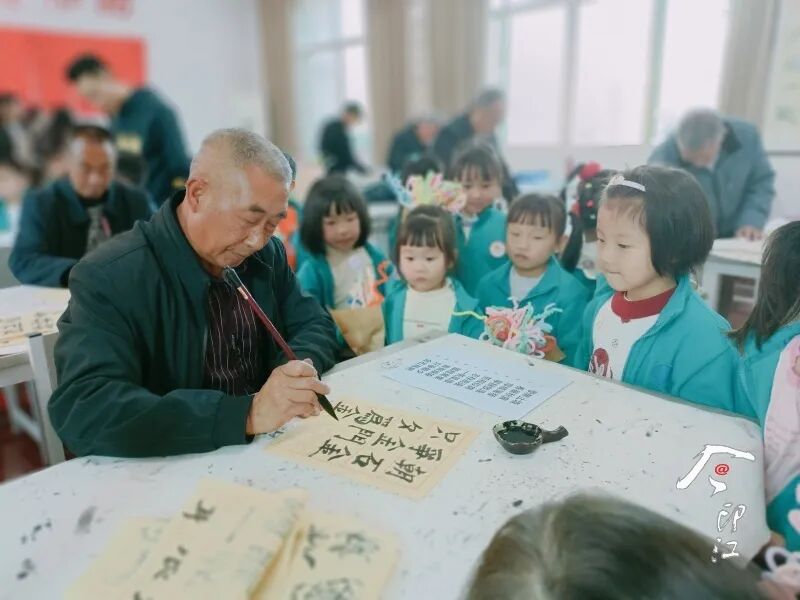 老人教儿童学写毛笔字。印江老年大学供图